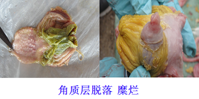 谷鳳柱教授稱,正因為上述霉菌及霉菌毒素無處不在的特性,所以只要是雞群能夠接觸到的地方,如:飼料、飲水、環(huán)境、網(wǎng)盤、墊料、粉塵等都有它們的存在。最常見又直觀的是它們對雞的內(nèi)臟器官的損傷,如:腺胃壁腫脹與水腫,有彈性并外翻,嚴重時粘膜糜爛;若偶有腺胃壁松弛,則多見為嘔吐毒素侵害所致;若腺胃乳頭消失,以致壞死崩解變薄,則多為嘔吐毒素+T2毒素共同導致的。下面是谷教授給我們分享的部分病理解剖圖片: